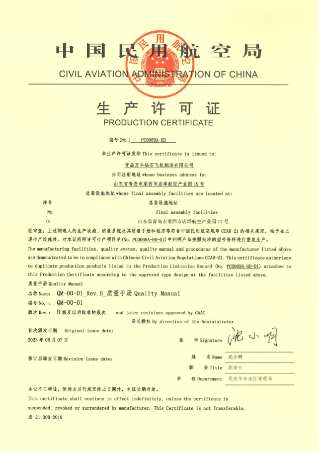 8月7日,民航華東地區(qū)管理局完成了對萬豐鉆石DA50飛機(jī)的PC生產(chǎn)許可審查,并頒發(fā)了生產(chǎn)許可證(PC)和項(xiàng)目單,標(biāo)志著鉆石DA50飛機(jī)已正式進(jìn)入中國量產(chǎn)。